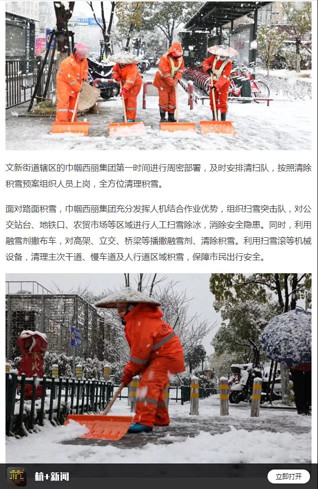 正月初七,開工大吉。年后復(fù)工的第一天,杭州迎來了新年第一場大雪,漫天的雪花覆蓋了杭城的大街小巷,銀裝素裹的雪景美不勝收。大雪給市民帶來了一份清新與愉快,也為環(huán)衛(wèi)工人們帶來了挑戰(zhàn)。巾幗西麗集團(tuán)第一時(shí)間進(jìn)行周密部署,及時(shí)安排清掃隊(duì),按照清除積雪預(yù)案組織人員上崗,全方位清理積雪。