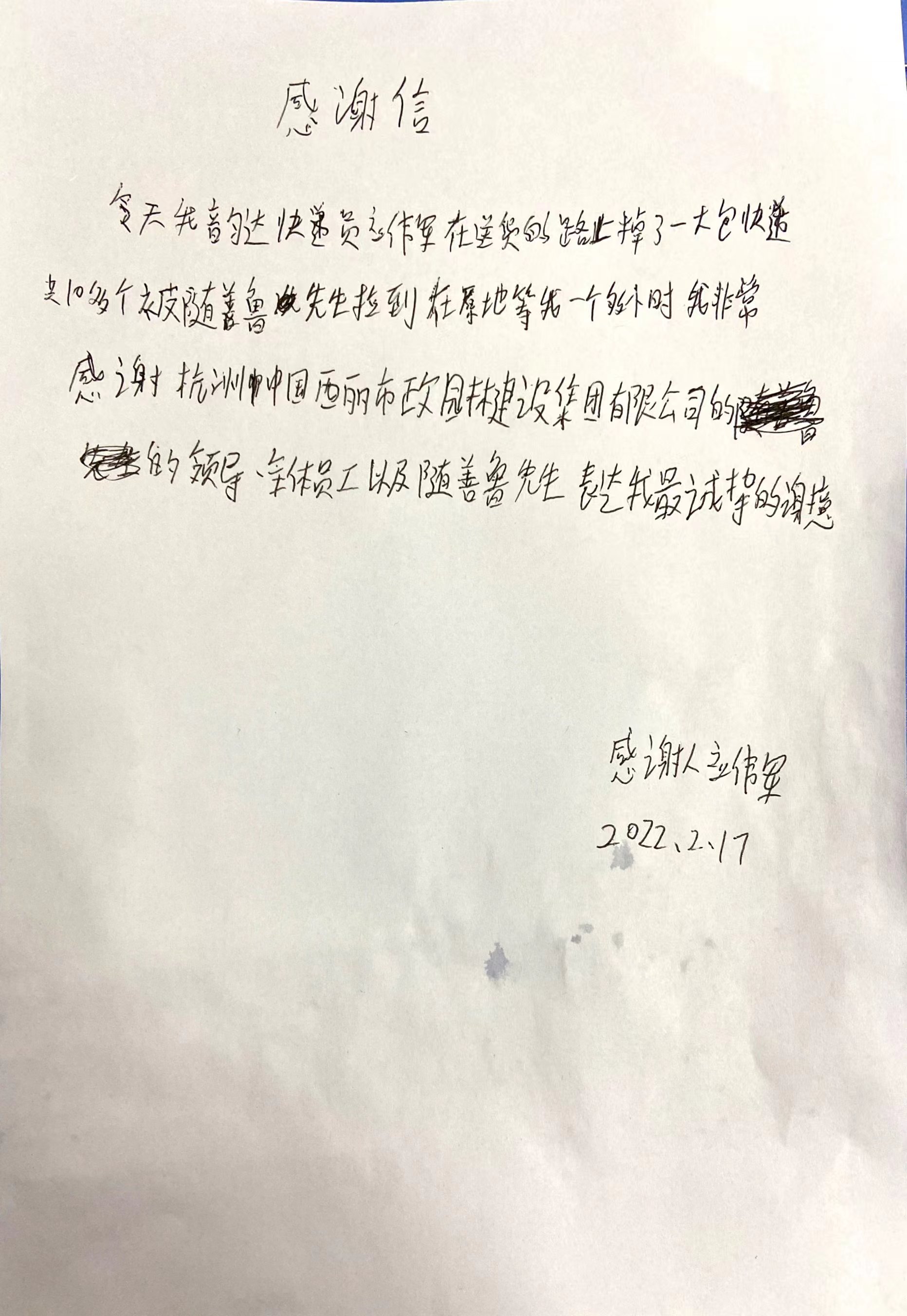 幾經(jīng)周折后終于找到失主,原來(lái)是韻達(dá)快遞小哥應(yīng)偉軍因?yàn)橹彼拓?,在路途中不慎丟失的,看到失而復(fù)得的包裹,小應(yīng)萬(wàn)分欣喜。當(dāng)?shù)弥S師傅之前在丟件的地方,冒著風(fēng)雪等待了他一個(gè)多小時(shí)后,小應(yīng)緊握隨師傅的手不住地稱贊,并激動(dòng)的寫下一份感謝信,表達(dá)對(duì)隨師傅和環(huán)衛(wèi)工人的誠(chéng)摯謝意。