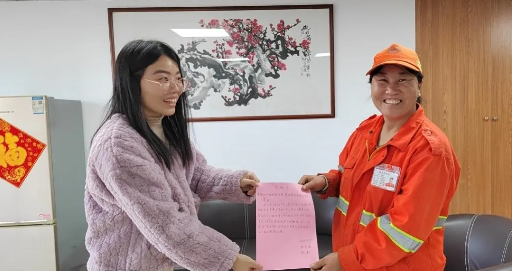 事后,失主阮女士當(dāng)面感謝了這位拾金不昧的環(huán)衛(wèi)工人,并通過一封感謝信對他們細(xì)心的工作和熱情待人的態(tài)度表達(dá)感激。