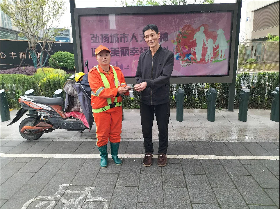 2024年3月17日,上城項目部保潔員潘武英在曇花庵路上作業(yè)時撿到一部智能手機,在原地等待,最終將手機歸還給了失主孫先生。